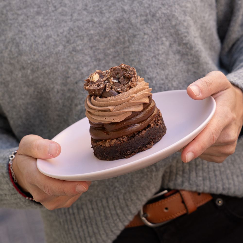 Brownie de chocolate, relleno con dulce de leche, crema de avellanas, Nutella, bombón Ferrero Rocher